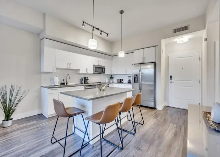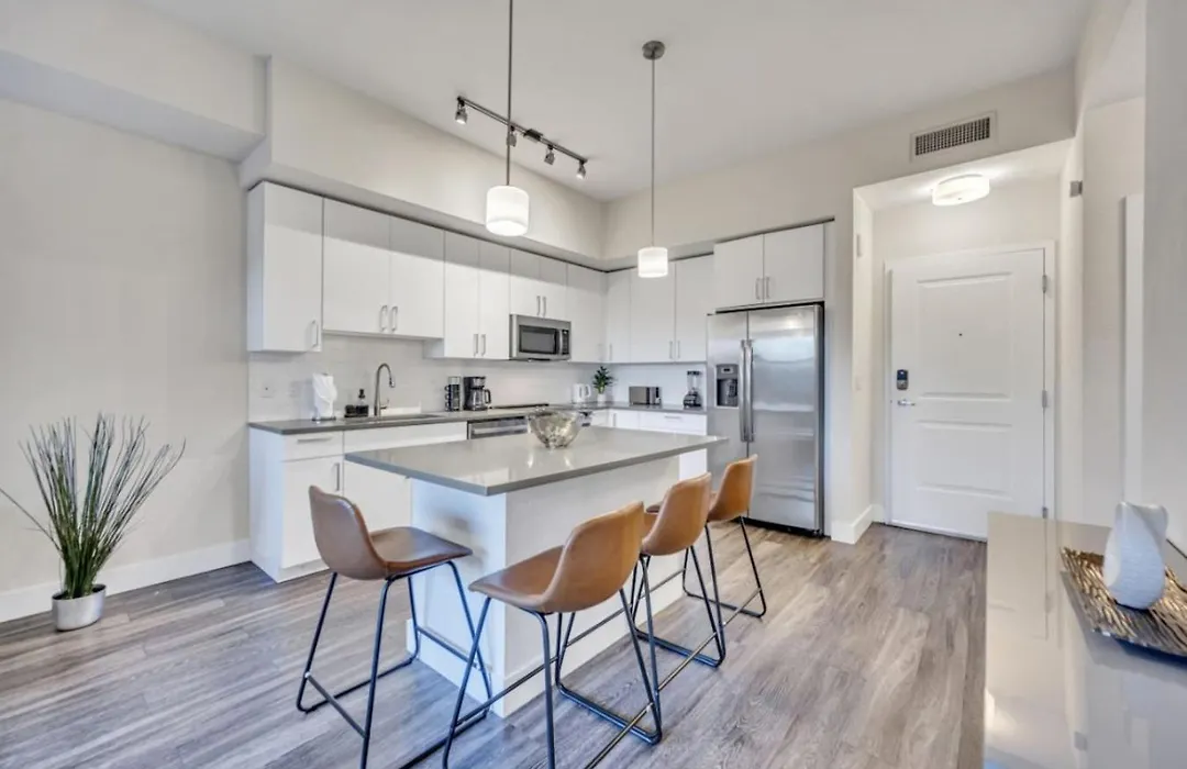 Eine komplette Küche mit einem Wasserkocher, einem Kühlschrank und Küchenutensilien gehört zur Ausstattung des Apartments Trendy One Bedroom Getaway Steps From Biscayne für Selbstversorger. Das Apartment Trendy One Bedroom Getaway Steps From Biscayne ist ganz nah an der Bushaltestelle Northeast 2nd Avenue & Northeast 24th Street.